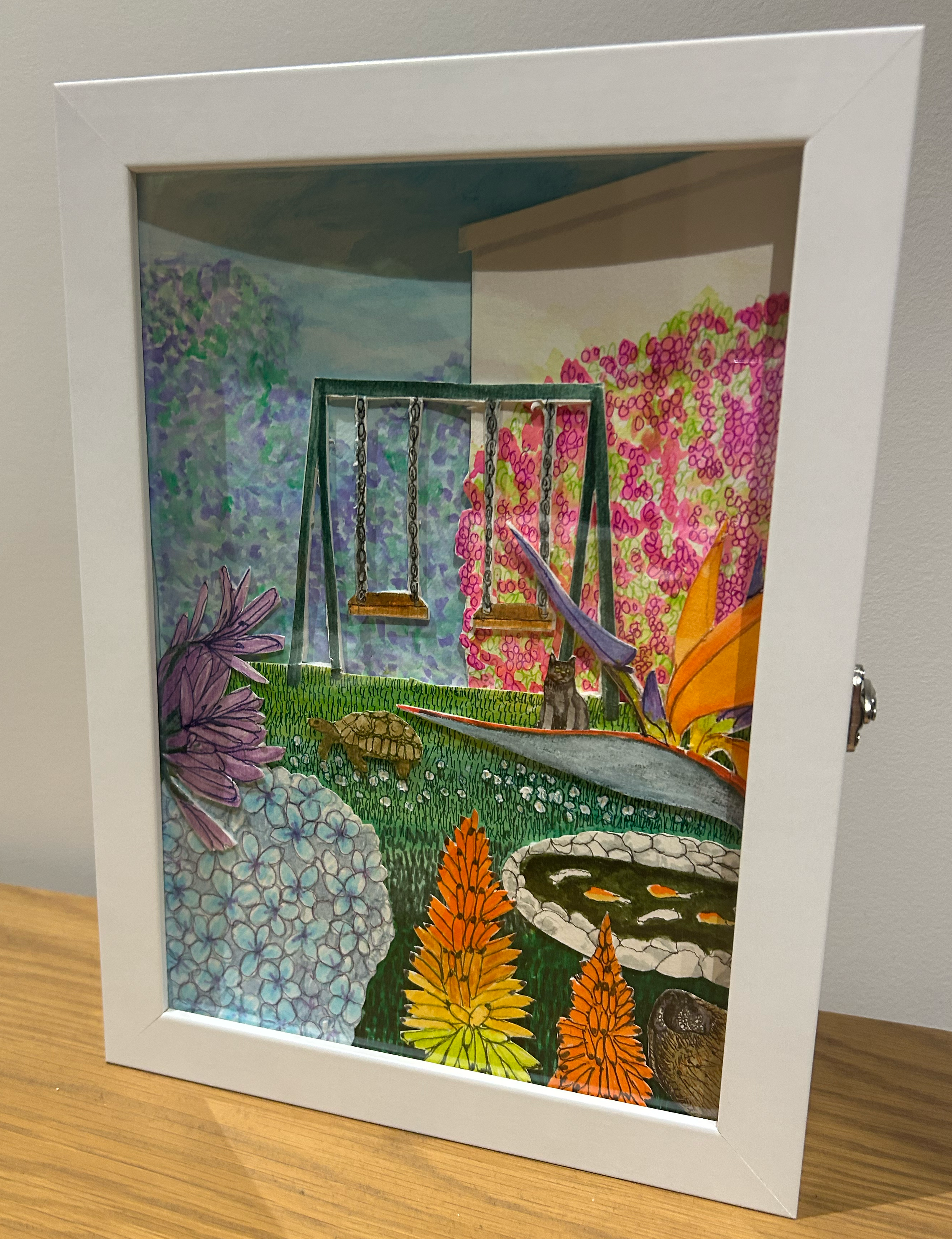 My scenographic illustrations are created from watercolour and ink drawings divided into layered card compositions and encased in perspex or wooden box frames. They draw on my early studies in set design.